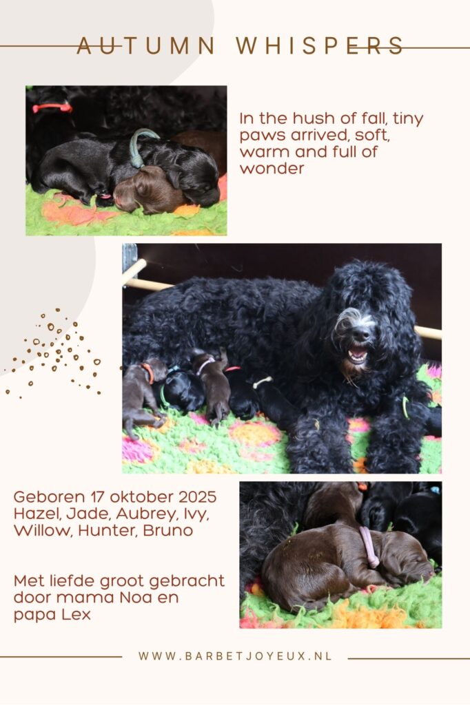De geboorteaankondiging staat nu ook op de website van de Barbetclub: www.barbetclub.com . Het nestje heeft de naam Autumn Whispers gekregen. De namen van de pups zijn Hazel, Jade, Aubrey, Ivy, Willow, Hunter en Bruno. De puppies van Noa en Lex zijn nu ruim een week oud. Je ziet ze groeien. Om bij mama te komen kunnen ze al aardig tijgeren. Ze gebruiken daarvoor steeds meer hun pootjes. Hun stamboomnamen zijn nu ook aan de Raad van Beheer doorgegeven.