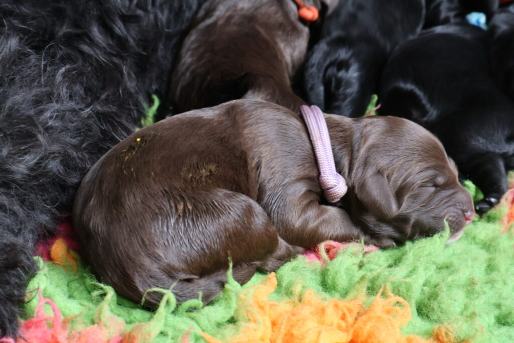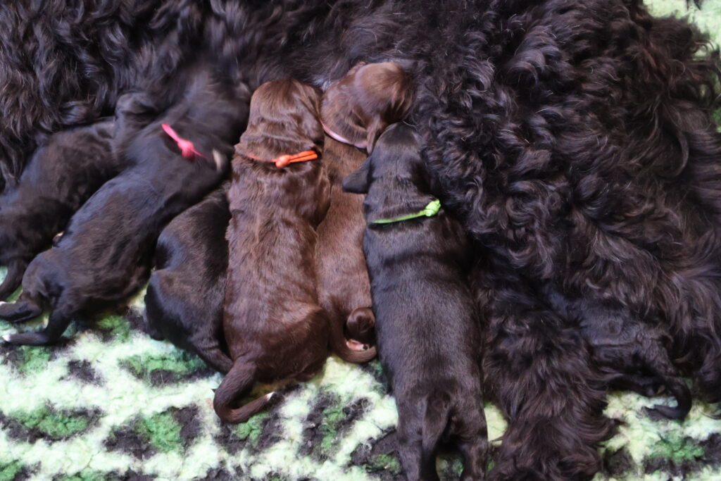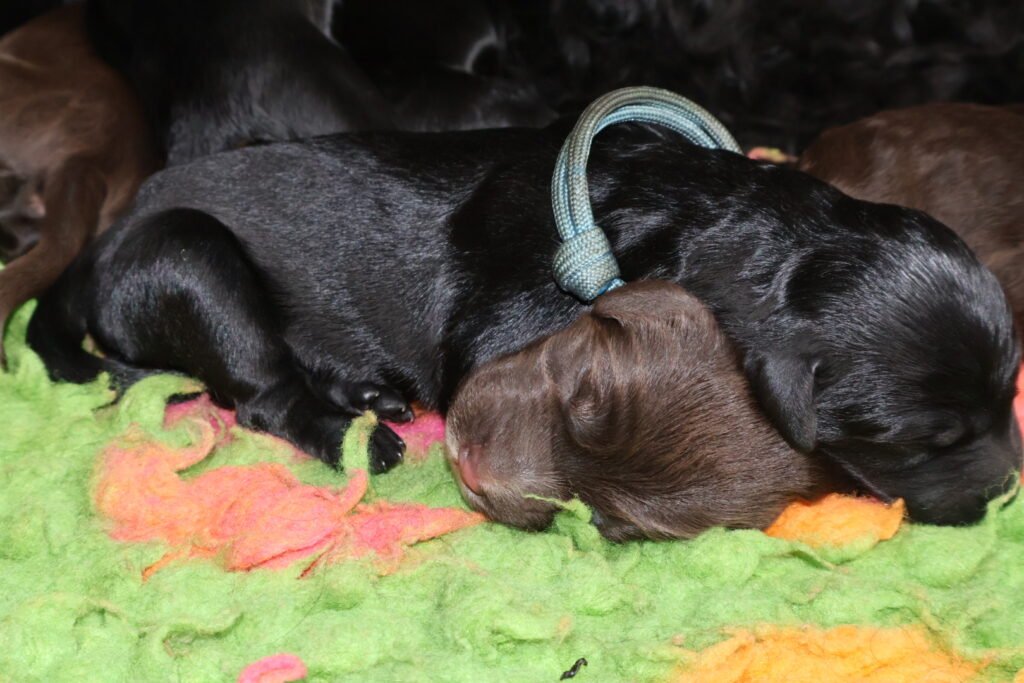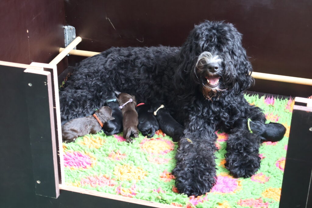 Amber en Lex zijn op vrijdag 17 oktober de trotse ouders geworden van 7 puppies: 4 teefjes en 3 reutjes. De puppies hadden een prachtig geboortegewicht dat varieerde tussen de 410 en 485 gram. Drie teefjes zijn zwart en één teefje is bruin. Bij de reutjes bijna hetzelfde, twee reutjes zijn zwart en 1 reutje is bruin. Ze hebben allemaal witte aftekeningen, de één wat meer dan de ander. Noa ging meteen in de ‘mamastand’ en is een op en top moeder. Voorlopig is het heel veel slapen en mama in goede conditie houden.